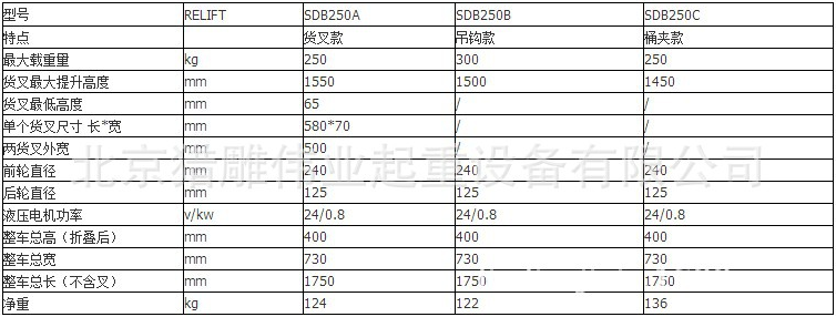 描述: 貨叉式裝車神器產品詳細參數頁,北京獵雕偉業起重設備有限公司。